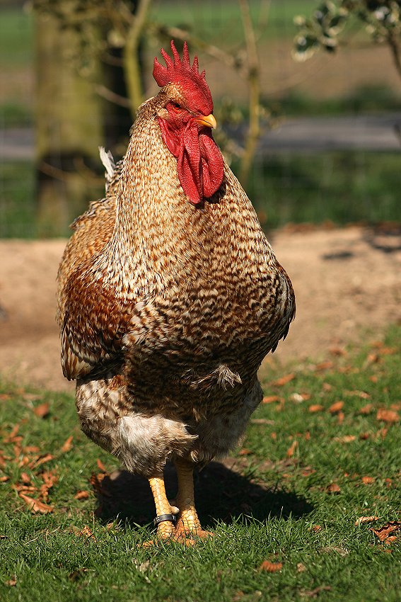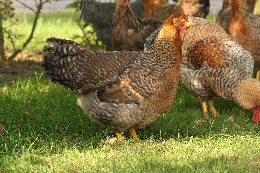 Die Gruppe setzt sich aus einer rebhuhnfarbig gebänderten Brahma, 2 Amrocks und 7 Bielefelder Kennhühnern zusammen. Der Hahn ist ebenfalls ein Bielefelder.