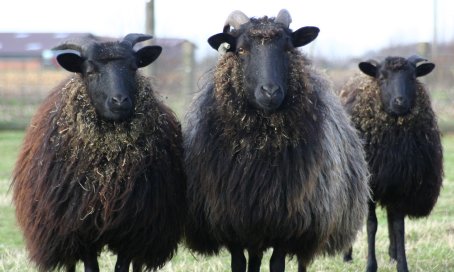 Die Lämmer werden mit schwarzer, gelockter Wolle geboren.